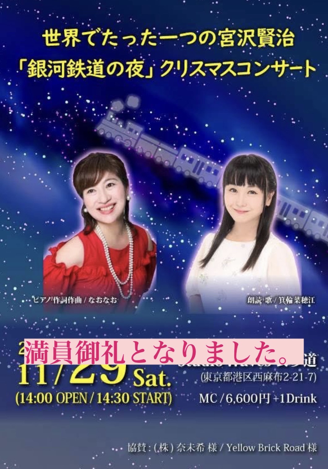 2025年11月29日(Sat)に表参道で開催致します『なおなお』楽曲による 世界でたった一つの宮沢賢治「銀河鉄道の夜」クリスマスコンサートは早い時期に満席となり御礼申し上げます。